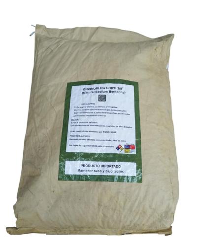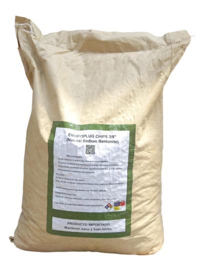 Arcilla de bentonita de sodio natural. Es un material formado por partículas que son medidas y clasificadas que se usa para sellar y taponar pozos de sondeo terrestres, el cual se comercializa en gránulos de 3/8".